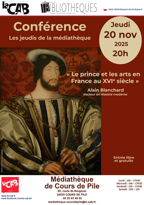 “LES JEUDIS DE LA MÉDIATHÈQUE” : Conférence  « Le prince et les arts en France au XVIe siècle » Alain Blanchard, docteur en Histoire moderne.