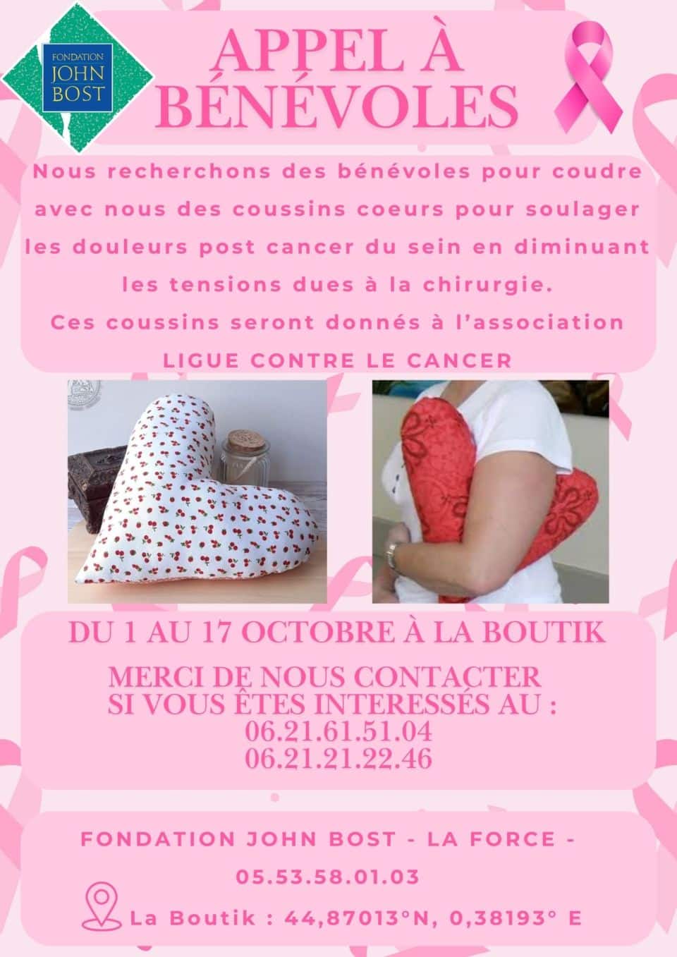 Nous recherchons des bénévoles pour coudre avec nous des coussins coeurs pour soulager les douleurs post cancer du sein en diminuant les tensions dues à la chirurgie.