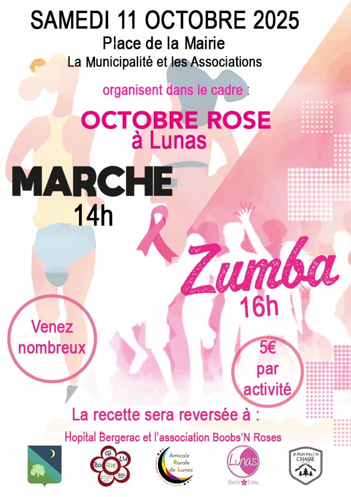 La municipalité de Lunas et les associations organisent dans le cadre d’octobre Rose une marche à 14h et Zumba à 16h.