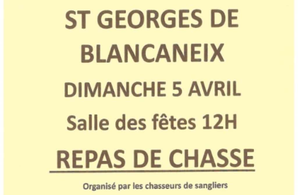 La commune de Saint-Georges-de-Blancaneix vous invite à partager un moment convivial autour d’un traditionnel repas de chasse, organisé par les chasseurs de sangliers. Rendez-vous le dimanche 5 avril à 12h, à la salle des fêtes, pour déguster un menu généreux mettant à l’honneur les saveurs du terroir : potage, terrine de sanglier, civet, rôti grillé, accompagnements, fromage et dessert.