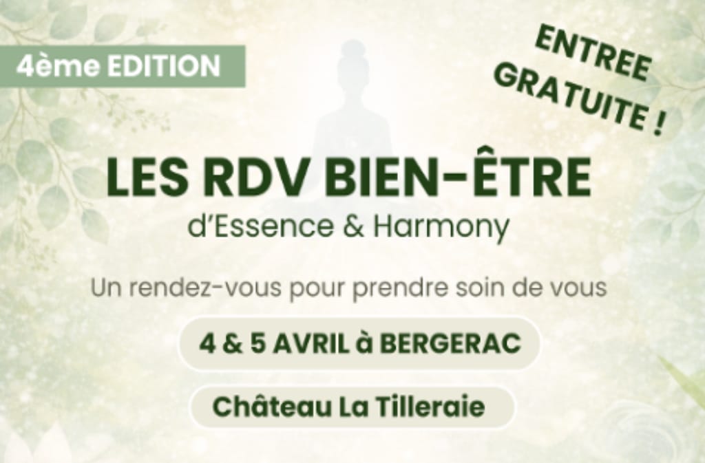 Les Rendez-vous Bien-Être, organisés par l’association Essence & Harmony, vous invitent à un week-end dédié à la découverte du bien-être, du développement personnel et de la spiritualité. Venez rencontrer de nombreux praticiens, thérapeutes, créateurs et artisans passionnés : soins énergétiques, pratiques corporelles, médiumnité, produits naturels et objets spirituels.
